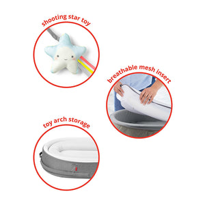 Whether you are at home, on vacation or visiting your grandparents, the Baby Nest Lounger from Skip Hop is easily transported from room to room or place to place. The baby nest lounger prevents baby from rolling out and lets your baby rest secure and serene. You can move your little one everywhere you go in total safety.